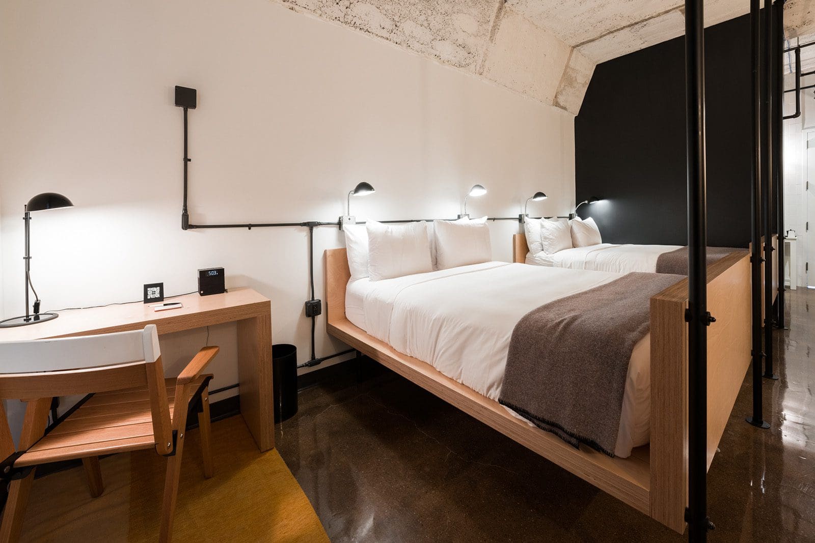 As with all Annex Lofts at The Robey, this room features custom designed furnishings and fixtures by Delordinaire, functioning factory style windows, Schoolhouse Electric bedside lamps, a large shower with floor to ceiling tile and rain shower head, utility style sink, spacious open ceilings with exposed ductwork, and individual storage space for multiple guests.