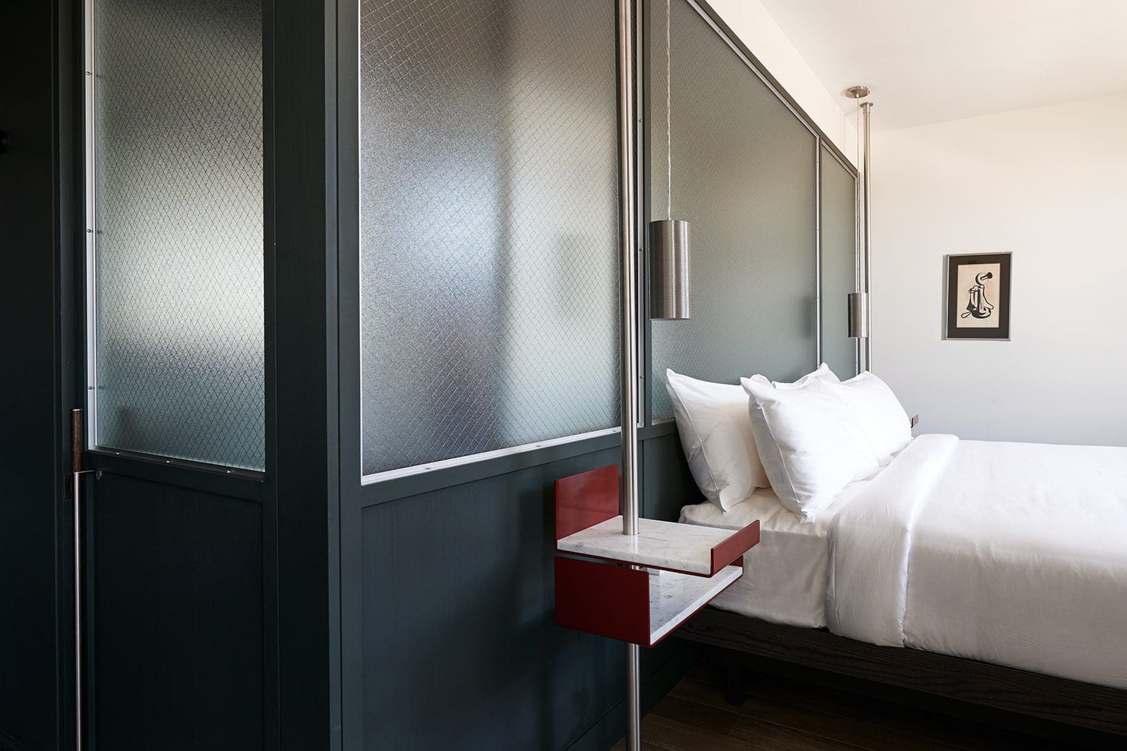 As with all Tower Rooms at The Robey, this room features Waterworks bath fixtures and custom made terrazzo tile, plus bold accents of oxide red and Calcutta marble tabletops designed for work or dining. We also hope you enjoy our mix of vintage and custom-designed furnishings, specifically curated to complement each room and our Art Deco-meets-Modern motif.