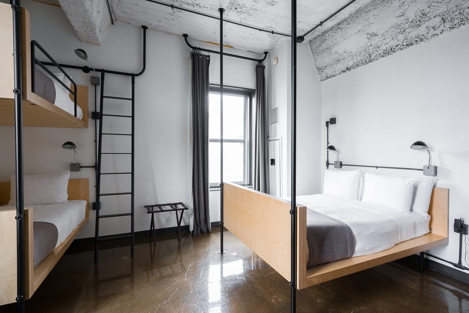 As with all Annex Lofts at The Robey, this room features custom designed furnishings and fixtures by Delordinaire, functioning factory style windows, Schoolhouse Electric bedside lamps, a large shower with floor to ceiling tile and rain shower head, utility style sink, spacious open ceilings with exposed ductwork, and individual storage space for multiple guests.